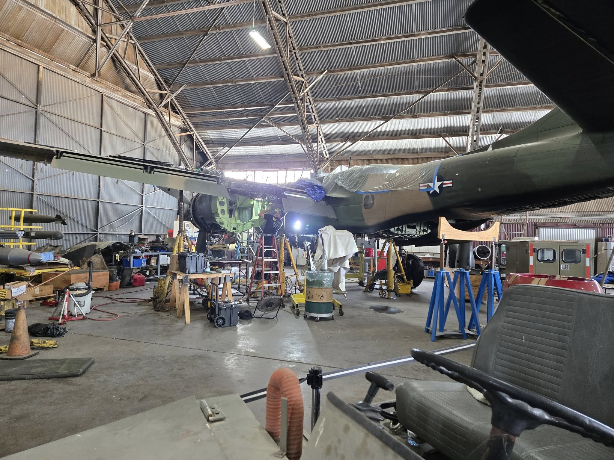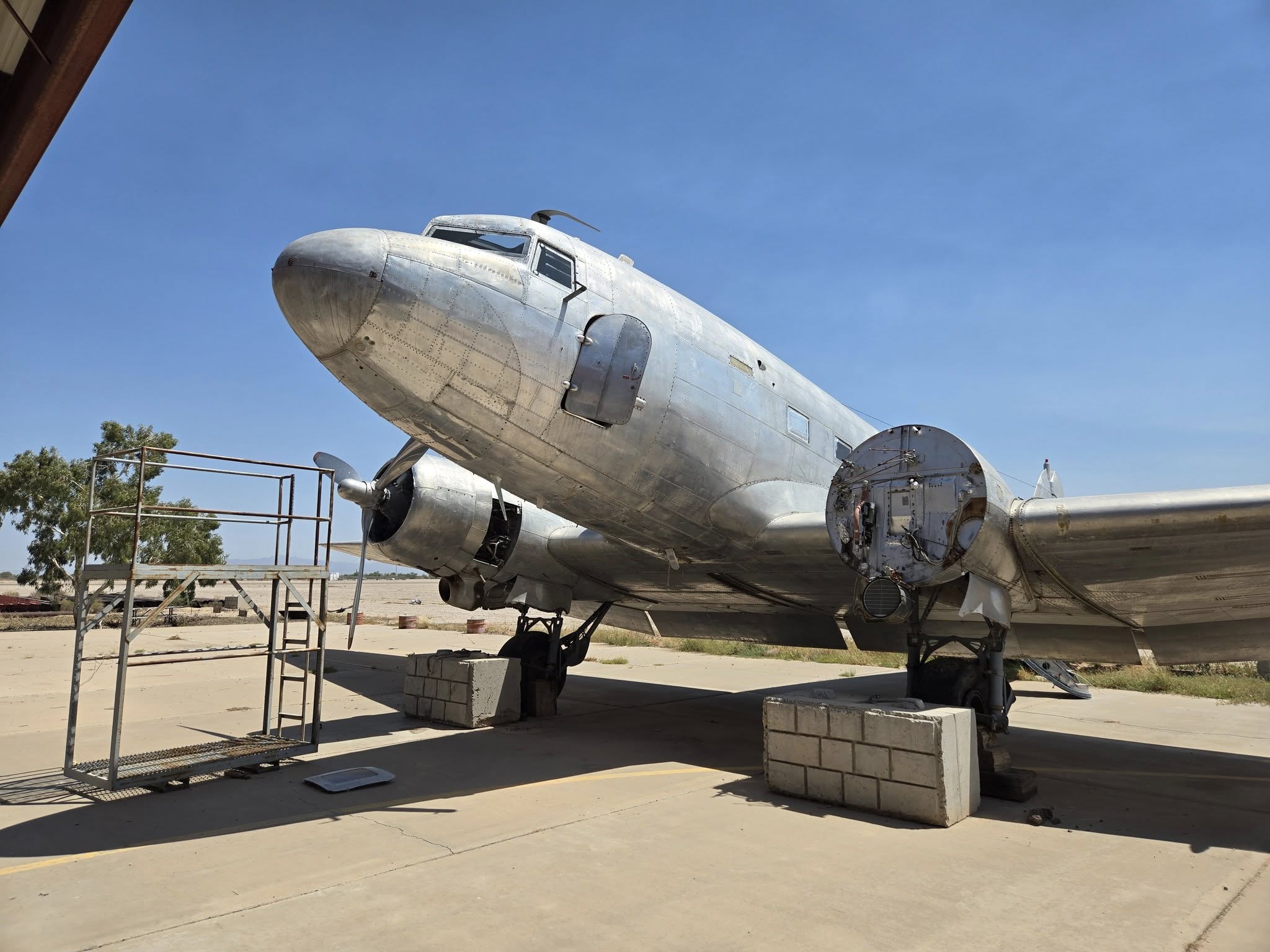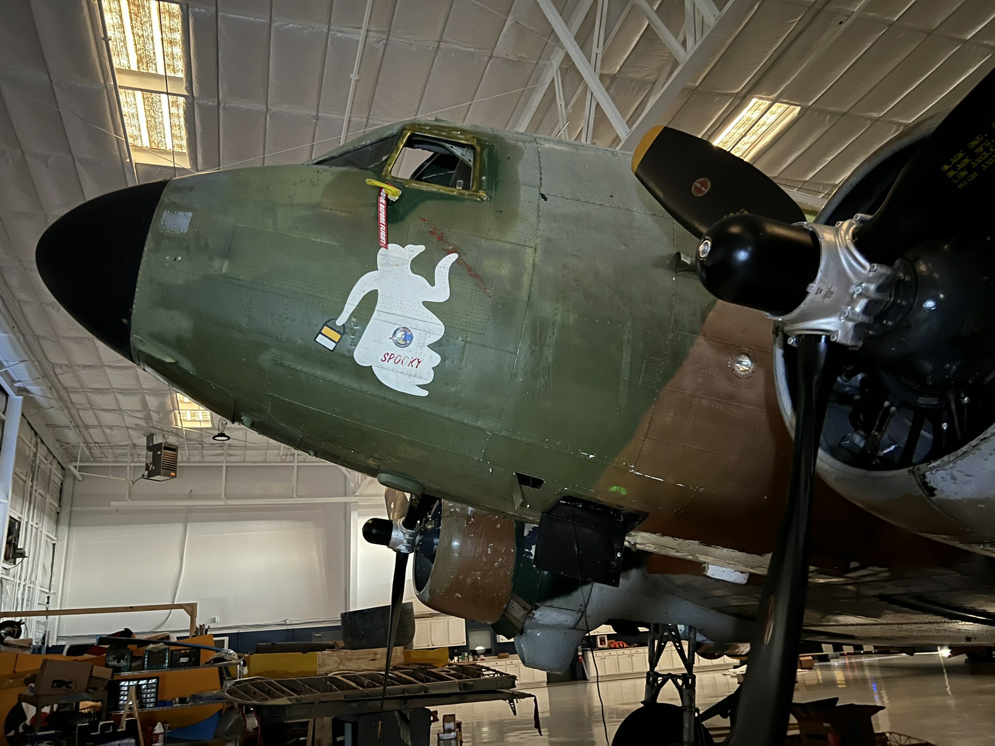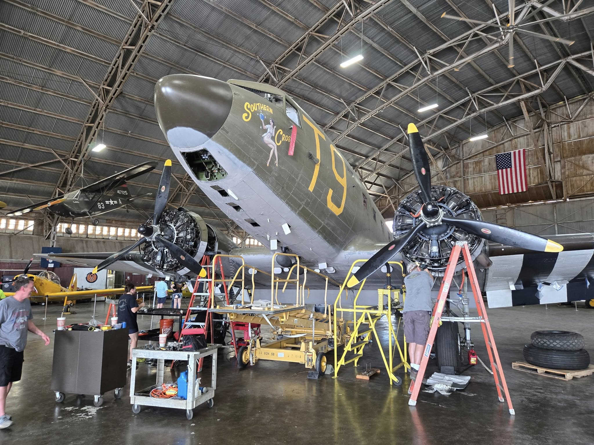 The aircraft is undergoing maintenance, with plans for a more in-depth restoration as an AC-47 gunship.