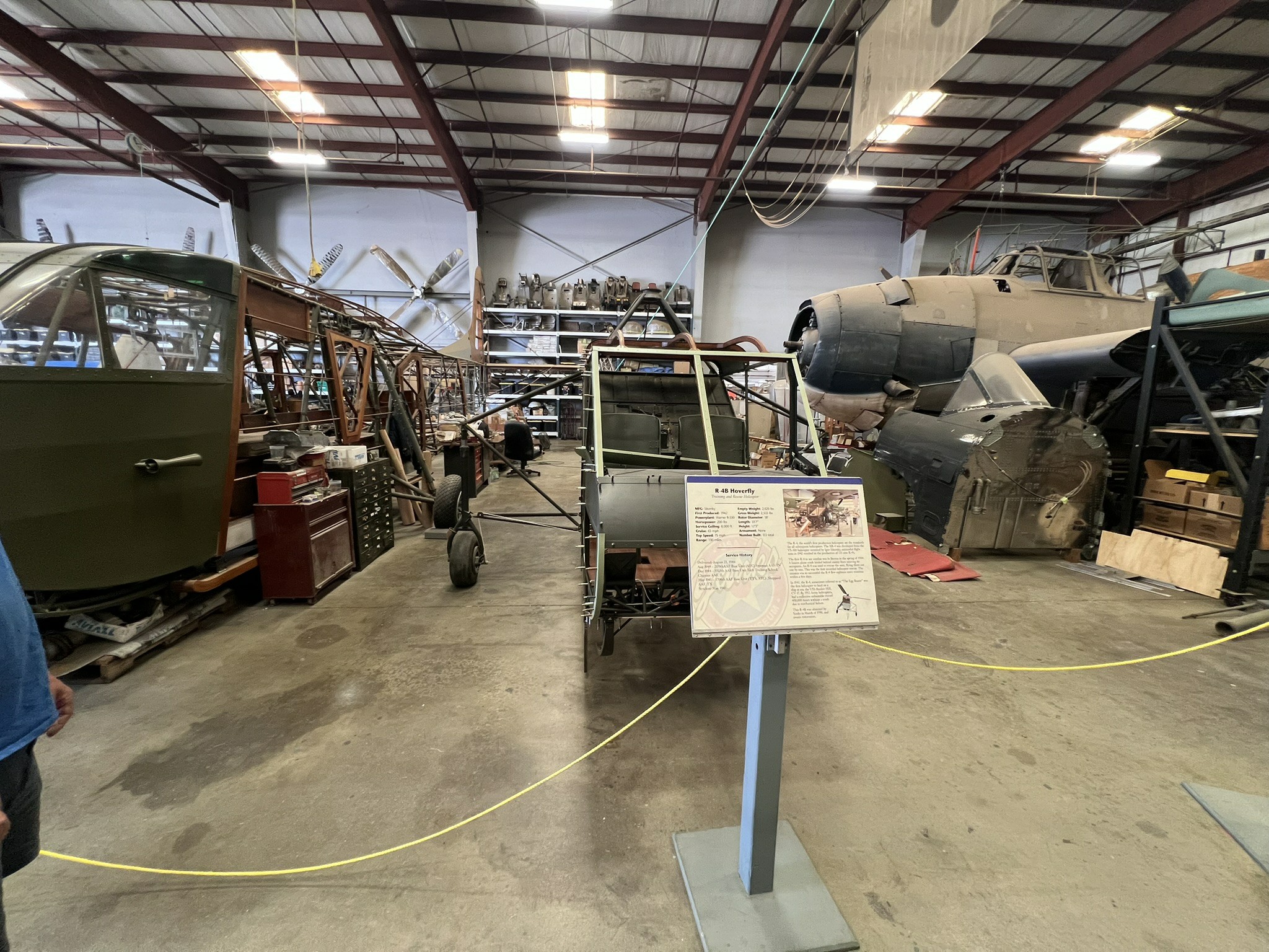 Three incredibly rare restoration projects, all beside one another in the shop at Yanks: from left to right, a Waco CG-4 Combat Glider (45-13696), Sikorsky R-4 Helicopter (43-46534), and TBF Avenger torpedo bomber.