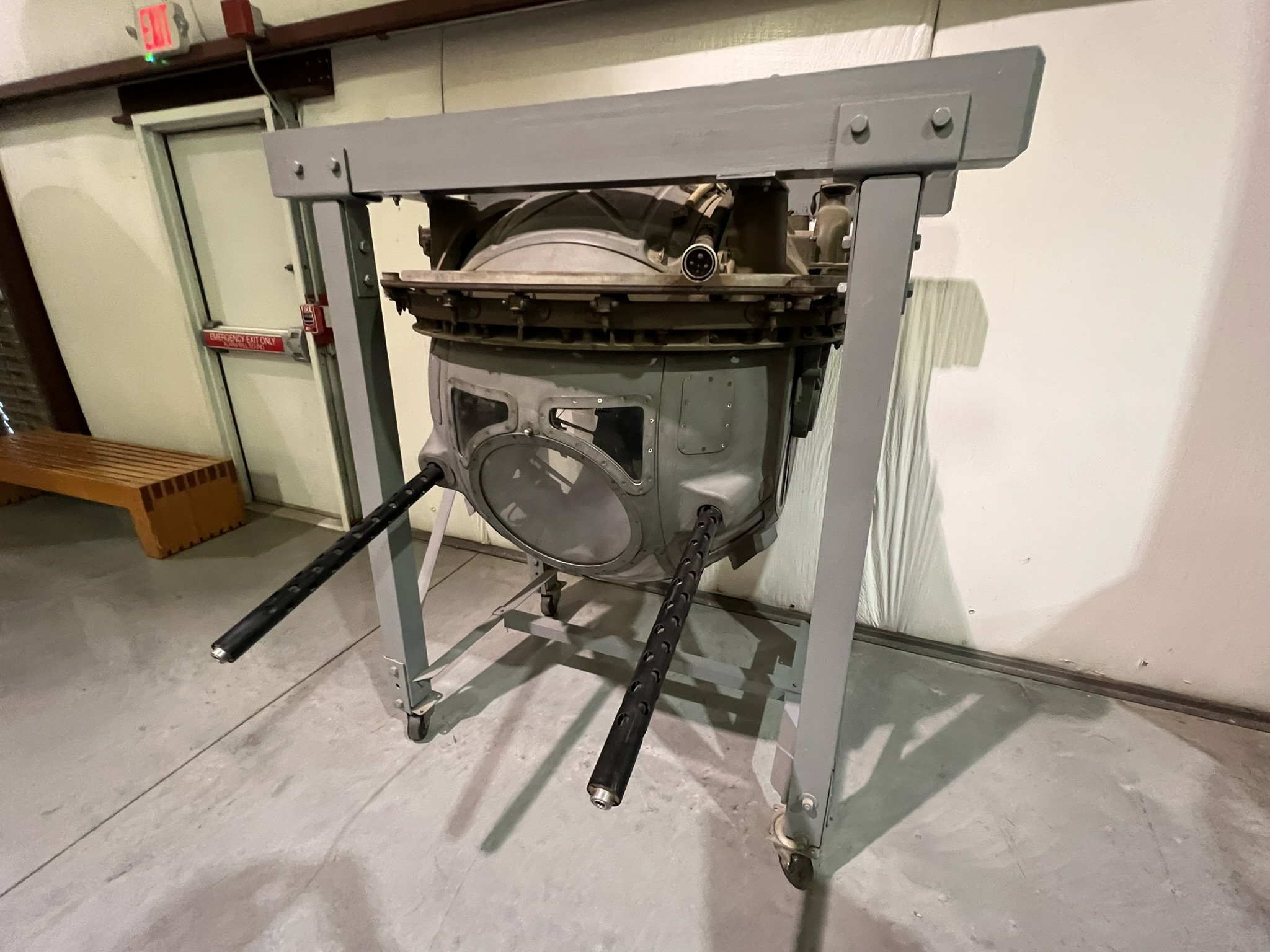 This example is a Type A-13, meaning that it was originally mounted to a Consolidated B-24. Most surviving ball turrets today are from B-24s. The B-24 notoriously suffered from weight issues and in 1945, when it became apparent that the Luftwaffe was no longer a serious threat, many B-24s had their turrets removed and placed into storage. Ironically, this act saved many turrets from the scrapyard.