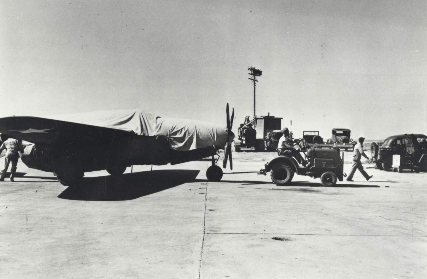 Designed around an engine copied from Frank Whittle’s centrifugal design, the P-59 was flight tested at Muroc Field, better known today as Edwards AFB. A mock propeller was attached to the aircraft’s nose when on the ground to hide the aircraft’s true nature.