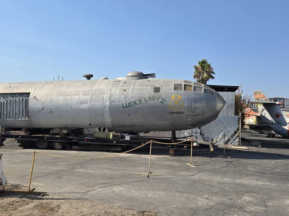 On 13 August 1950, she crashlanded near Davis-Monthan AFB, Arizona after an engine failure. Deemed damaged beyond repair, her fuselage was mounted to a semi trailer. It is unclear when Lucky Lady II arrived at Planes of Fame but she has remained in their backlot a long, long time. At some point, a set of replacement wings, taken from a C-97 Stratocruiser (which were identical), were placed nearby for a possible future restoration.