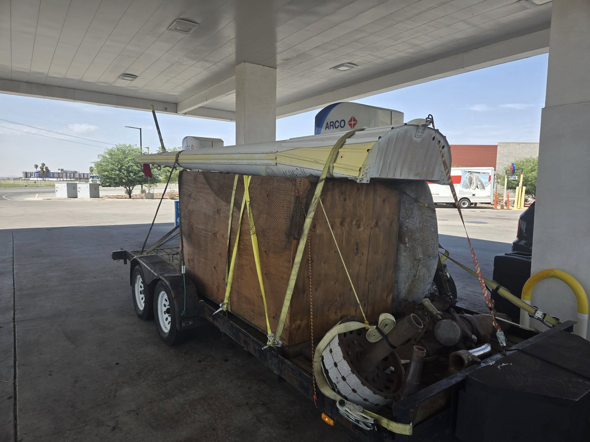 The pieces at the front of the trailer are the main and nose landing gear of a Consolidated B-24. The box is likewise filled with Liberator components -all destined for Project Warbird’s Liberator II Maid of Athens.