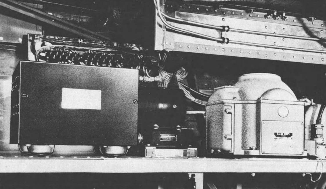 The amplifier box (left) was mounted the crawlway into the B-17’s nose, just underneath the cockpit. Above it sits the autopilot junction box, and to the right the system’s inverter and vertical gyro.