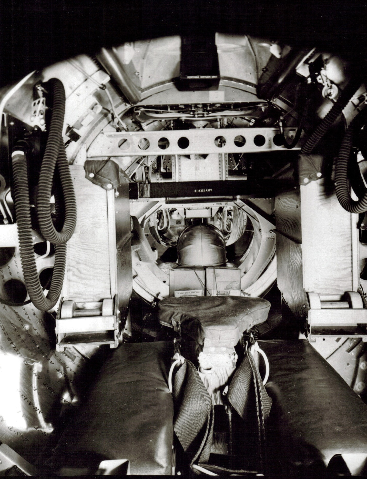 The interior of a B-17’s tail gun position, looking back from the guns themselves. Though not visible, the gun camera control was mounted just to the right of camera, beside the gunner’s heated suit rheostat.
