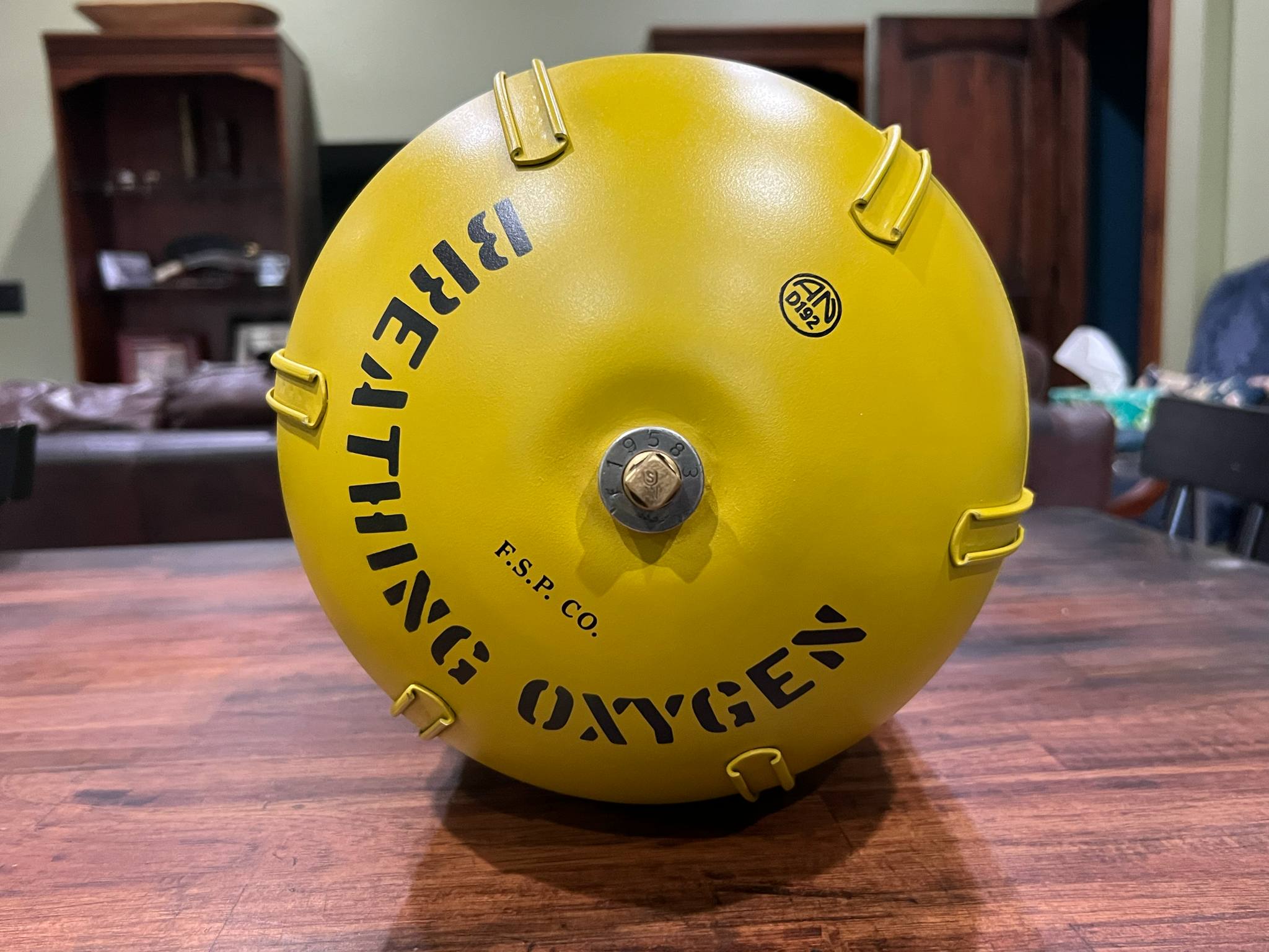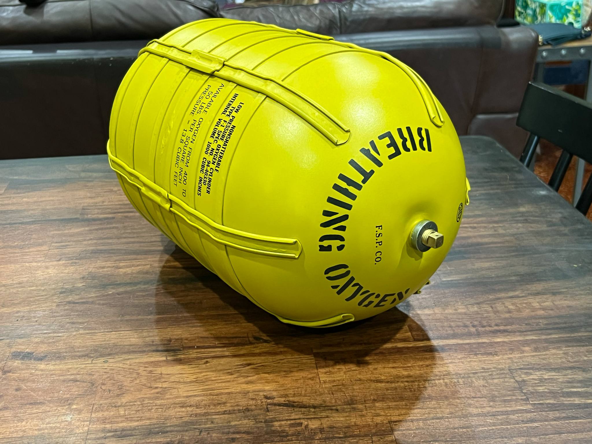 The Type F-1 Oxygen Tank weighed roughly nine pounds, being 17.5 inches in length and holding 13.8 cubic feet of oxygen.