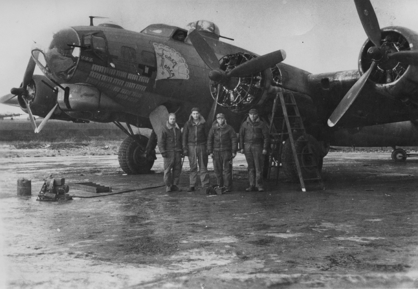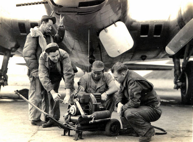Ground crews pose with Fancy Nancy IV (42-31662, 401BG). Note the APU on the left and the power cable running from it to the electrical plug beside the nose hatch.