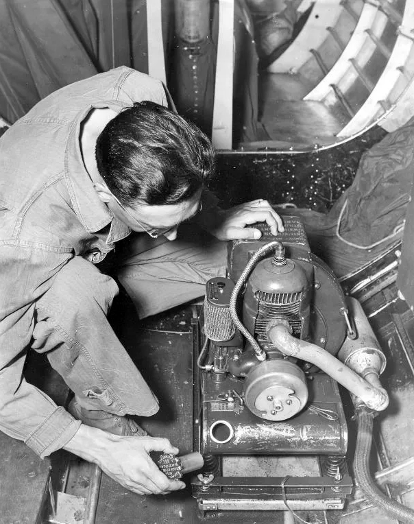 Originally, the Boeing B-17 was designed to carry its APU in the waist compartment, directly across from the waist entry door beside the chemical toilet. However, since the APU was primarily used by the ground crews, the APU was generally treated as “fly-away” equipment, with Gs ultimately delivering the APU loose on the radio compartment floor. The B-17’s APU was the Type C-10, the Army designation for HRU-28 and HRU-28A generators. Similar to a large lawnmower engine, these units were appropriately manufactured by the Homelite Corporation of Port Chester, New York.
