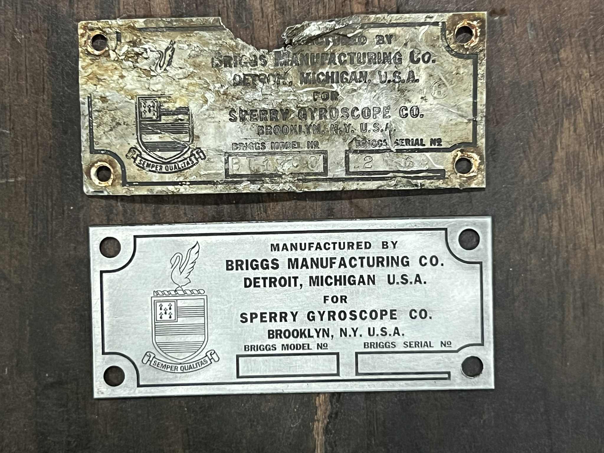 We do not know for sure which aircraft the assembly came from, but we can tell that said turret was made by Briggs (as opposed to Emerson), just like one on Lucky Thirteen. Eric Miller of Project Warbird donated the missing brush holder bar and Fred Bieser was able to help with the missing cover plate. Fred was also kind enough to loan the missing placards for recreation, including the turret’s dataplate, which took some time to perfect. With help from Sean Berry and Eric Miller, these placards are now recreated and installed, with the cover plate fully restored and ready for installation.